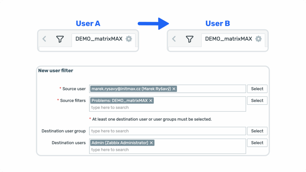 User Filter Manager zjednodušuje sdílení a správu filtrů v systému Zabbix tím, že administrátorům umožňuje centrálně definovat, distribuovat a udržovat konzistentní filtry napříč uživateli a skupinami. Je ideálním řešením pro týmy, které vyžadují sjednocené monitorování a chtějí zkrátit čas potřebný k nastavení systému.