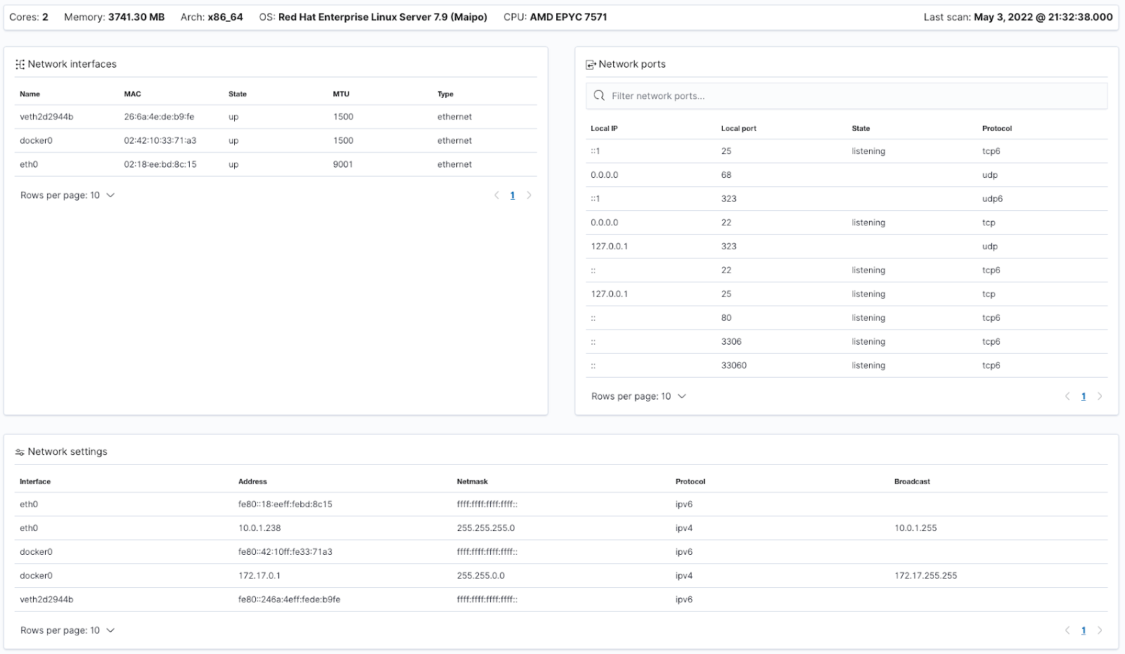 Shromážděná inventární data pro každý ze sledovaných zařízení lze vyhledávat prostřednictvím rozhraní Wazuh RESTful API a z webového uživatelského rozhraní. Jedná se zejména o využití paměti, místa na disku, specifikace procesoru, síťová rozhraní, otevřené porty, spuštěné procesy a seznam nainstalovaných aplikací.