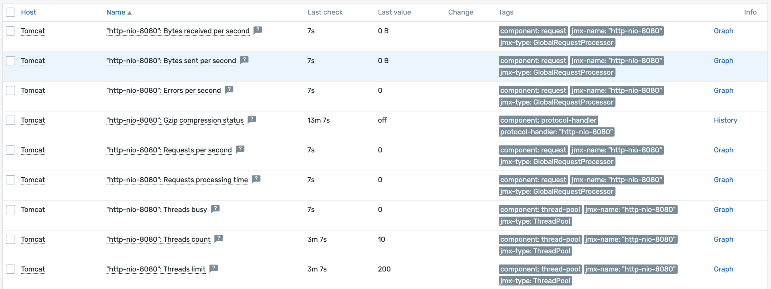 V tuto chvíli by měly vaše monitoring položky na hostu Tomcat začít přijímat data.