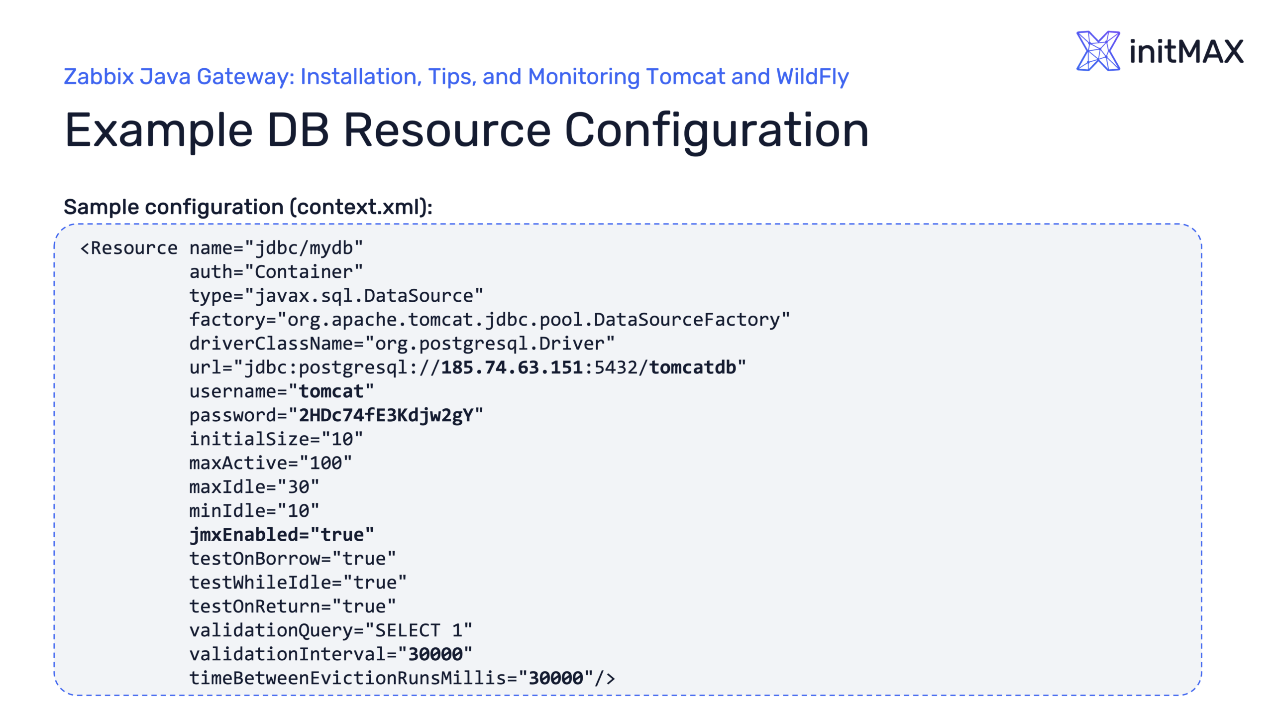 - Pokud nevidíte metriky, které vás zajímají (například statistiky DB connection poolu), může být potřeba je povolit na úrovni driveru/poolu. Například lze přidat parametr jmxEnabled=“true“ – ten bývá často definovaný v context.xml