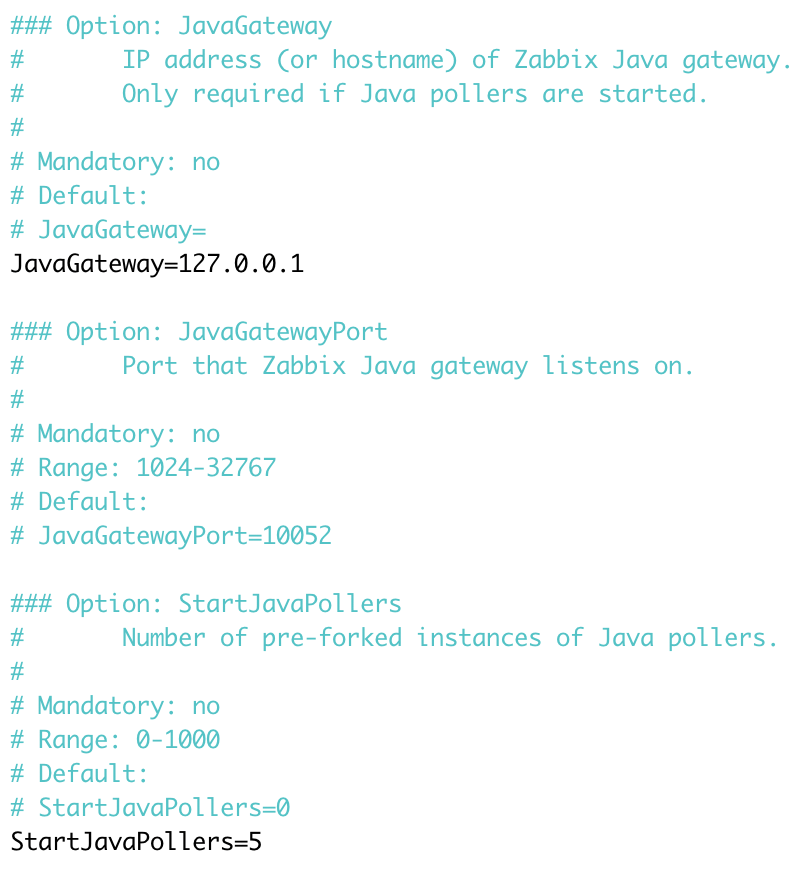- StartJavaPollers: počet Java pollerů spouštěných na Zabbix serveru/proxy