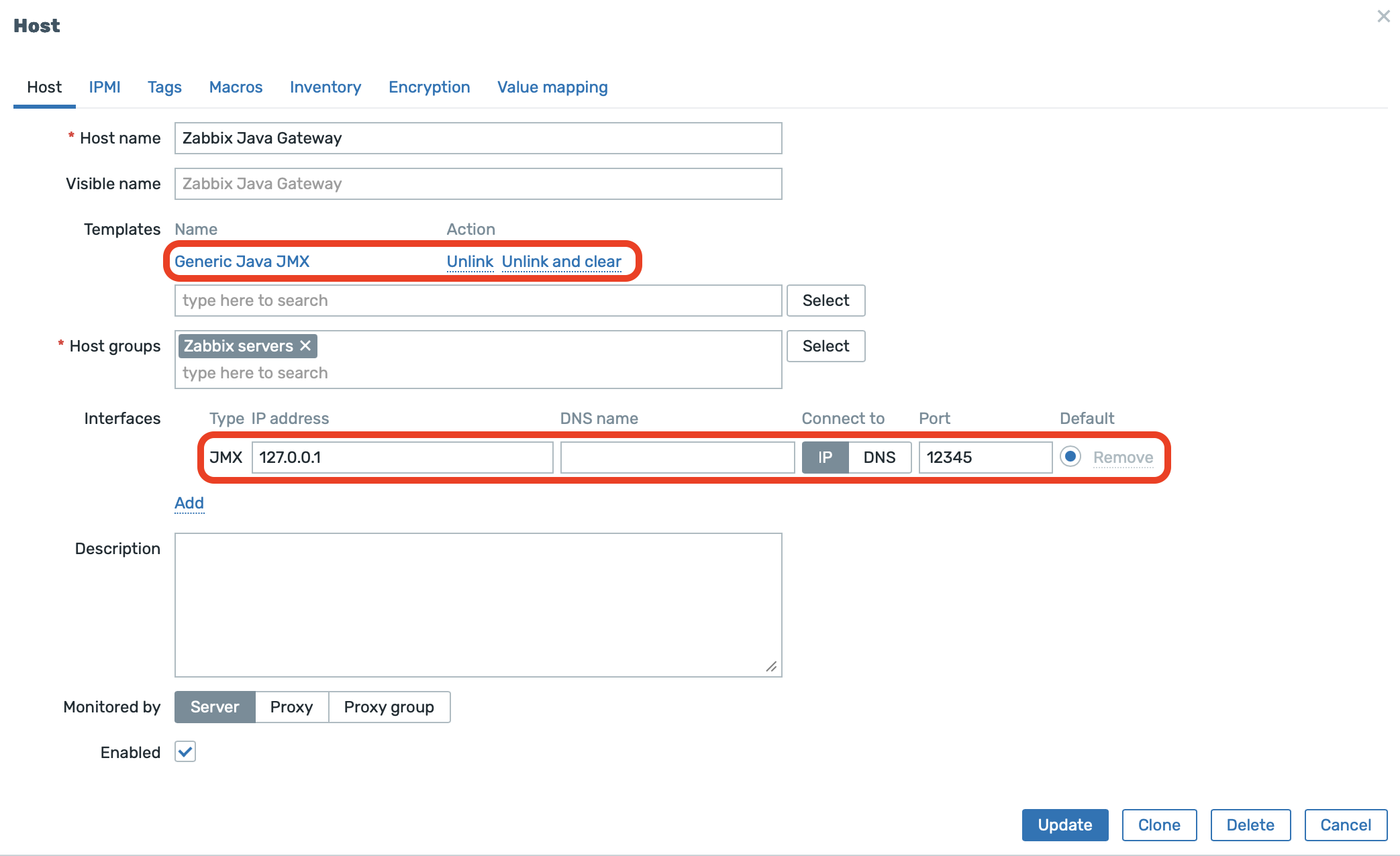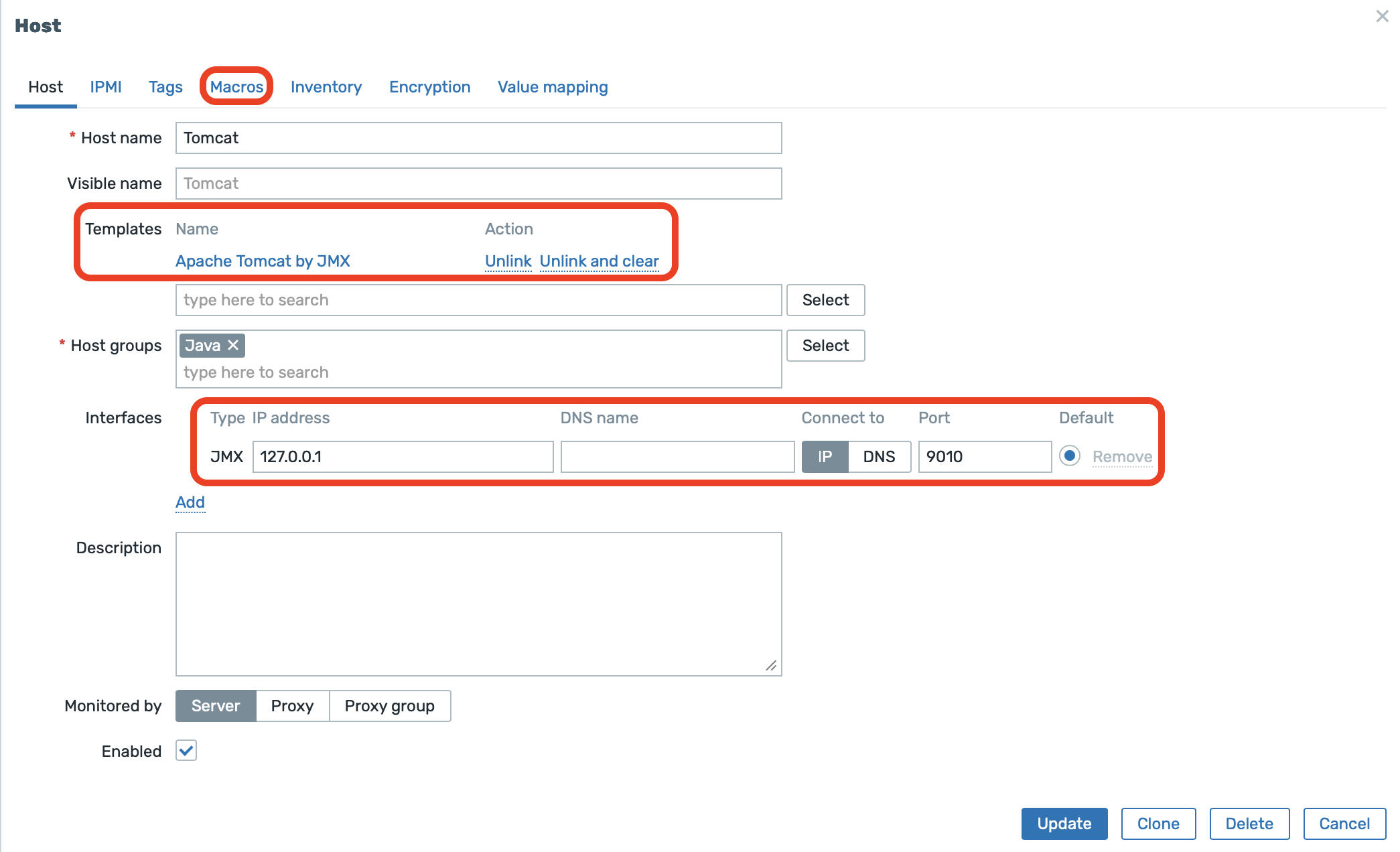 - Nastavte správnou IP nebo DNS adresu Tomcatu a port (ujistěte se, že firewall umožňuje přístup ze Zabbix Java Gateway). V našem případě běží Tomcat, Zabbix Server i Zabbix Java Gateway na stejném hostu, proto používáme localhost. V praxi je takové nasazení spíše nepravděpodobné.