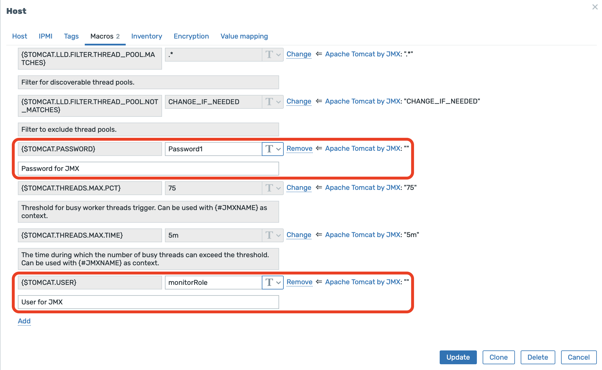 {$TOMCAT.PASSWORD}— v našem případě je toPassword1(best practice: označte tuto hodnotu jako Secret text){$TOMCAT.USER}— náš uživatel jemonitorRole