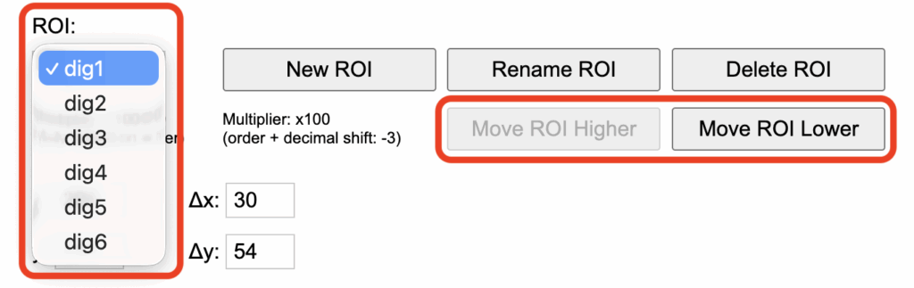 Důležitou částí je správné seřazení těchto okének. K tomu slouží tlačítka Move ROI Higher a Move ROI Lower. Pořadí musí být 1–6 — nesmí dojít k přeskočení žádné hodnoty.