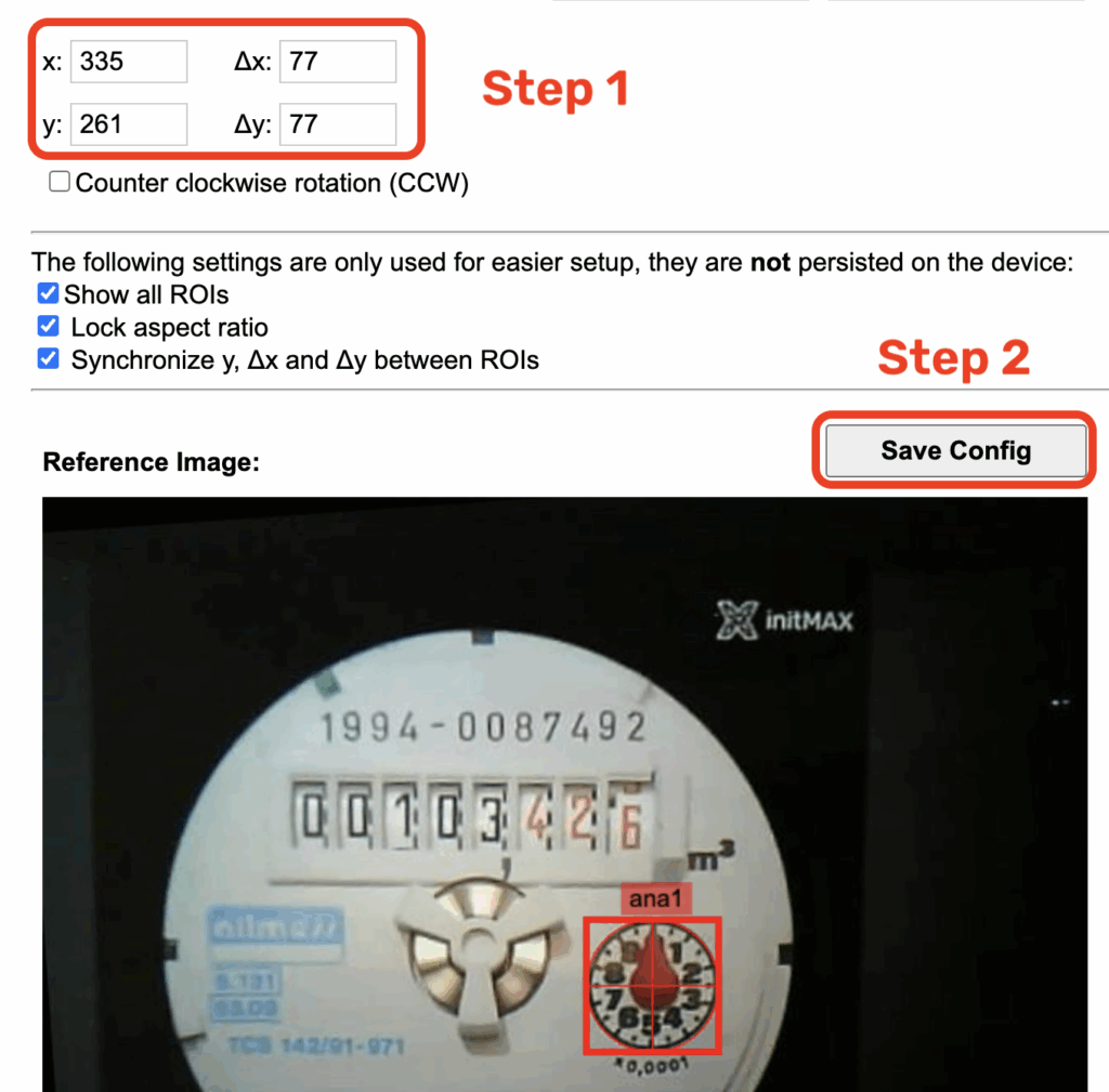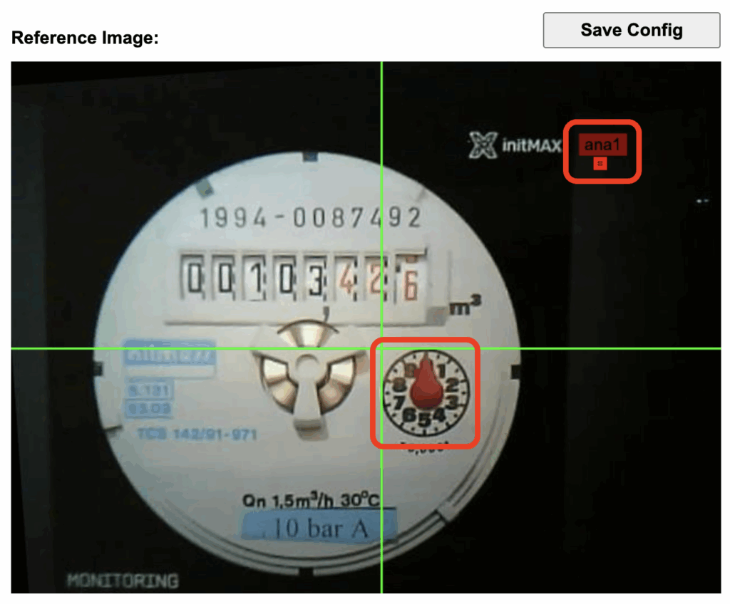 Poté vyberte ana1 a na obrázku označte oblast analogového ciferníku. Pro snadnější orientaci si můžete umístit markery na okraje ciferníku, abyste získali přesnější vymezení.