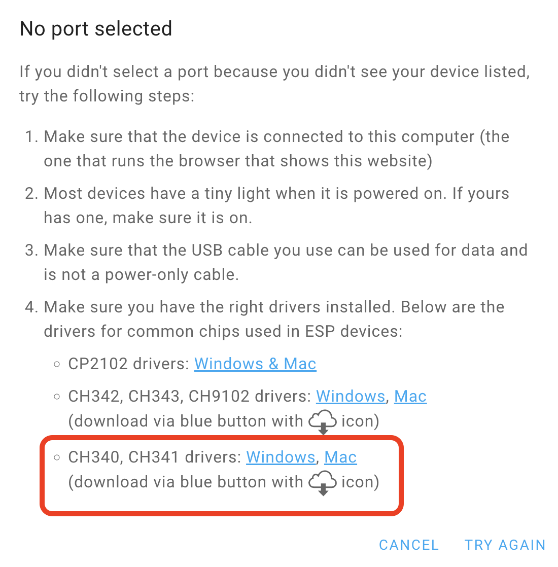 Naše zařízení používá čip CH340C, proto v seznamu vyberte CH340 pro váš operační systém a nainstalujte jej.