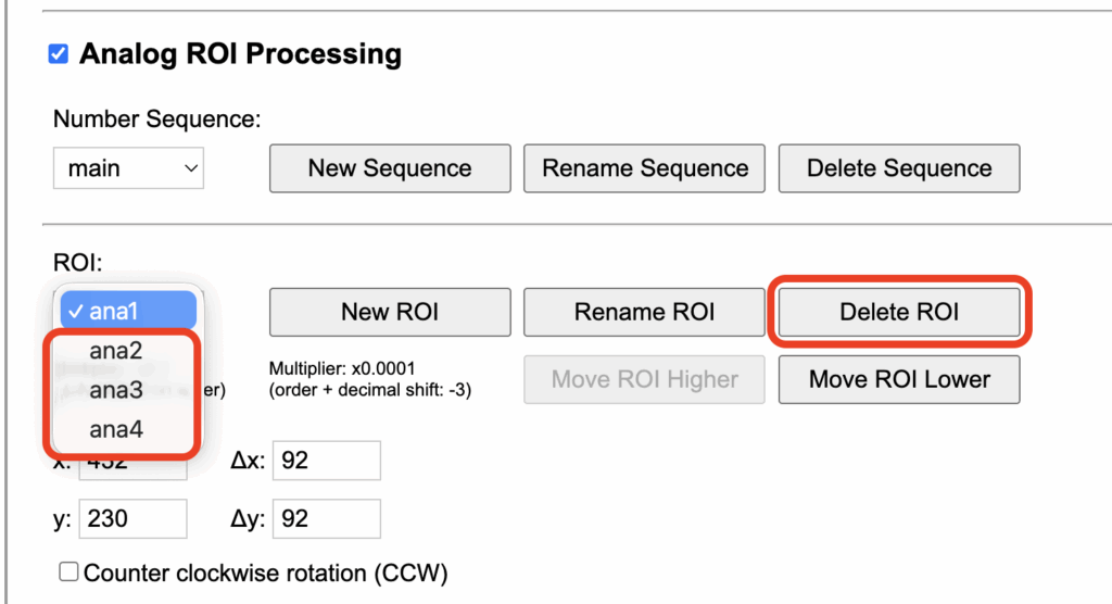 Zde je situace opačná — musíme odebrat analogová políčka, aby nám zůstalo pouze jedno. Políčka je potřeba odstraňovat odzadu, takže začněte výběrem ana4 a klikněte na Delete ROI. Stejným způsobem postupně odstraňte všechna další, dokud nezůstane pouze ana1.