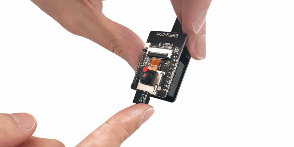 Vyjměte z adaptéru samotnou microSD kartu a opatrně ji vložte do slotu na ESP32. Karta se vkládá logem nahoru a zasune se až do konce, dokud necvakne aretační zámek. Karta pak drží pevně na místě.