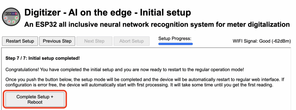 V posledním kroku stiskněte Complete Setup + Reboot – zařízení se restartuje a po dokončení restartu se automaticky pokusí provést první měření.