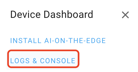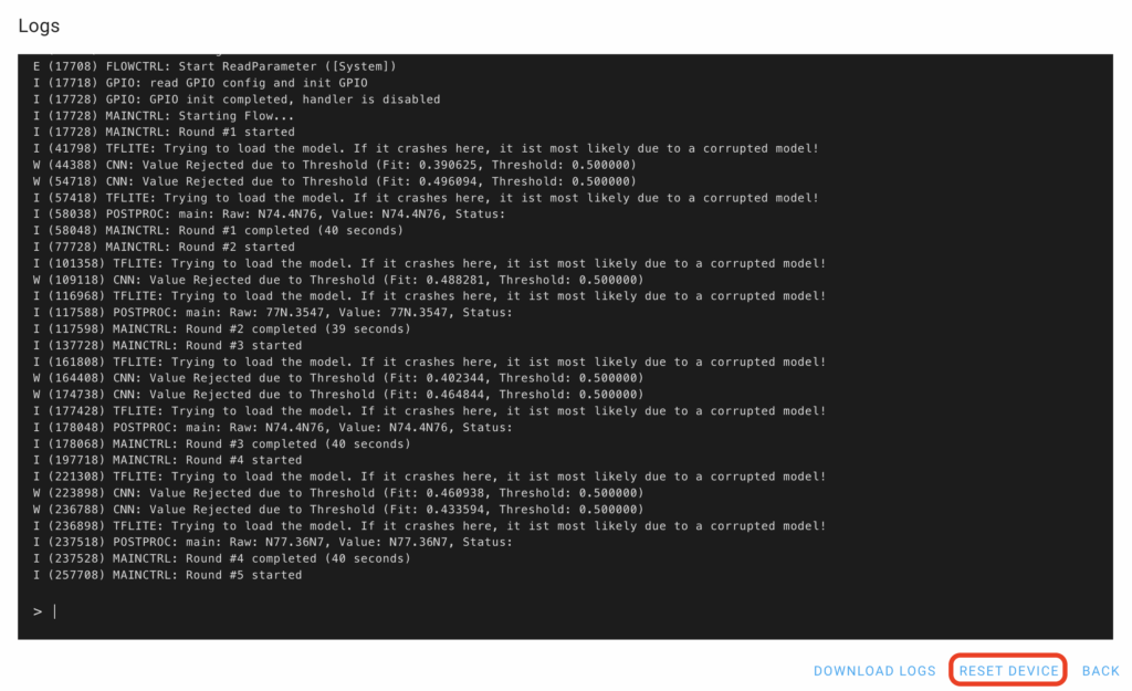 Po připojení k Wi-Fi si ponechte otevřené okno s debug logem a v nové záložce otevřete webové rozhraní AI on the Edge: