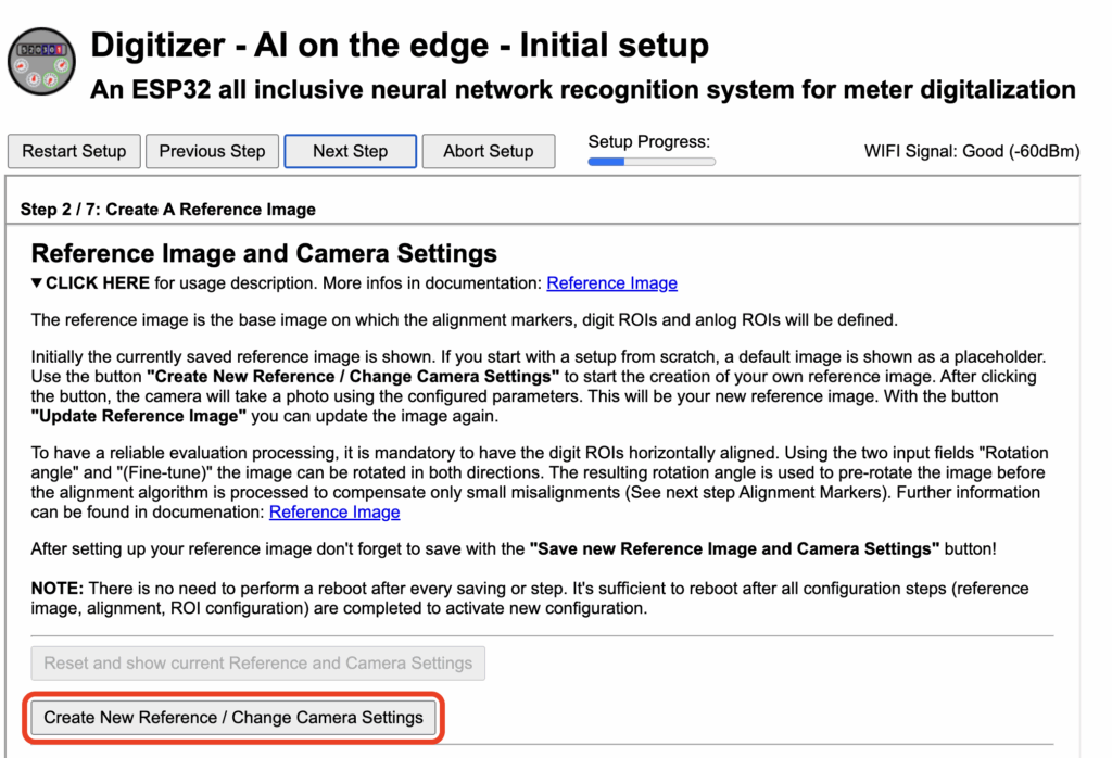 Klikněte na tlačítko Create New Reference / Change Camera Settings a vyčkejte několik vteřin, než se obrázek načte.