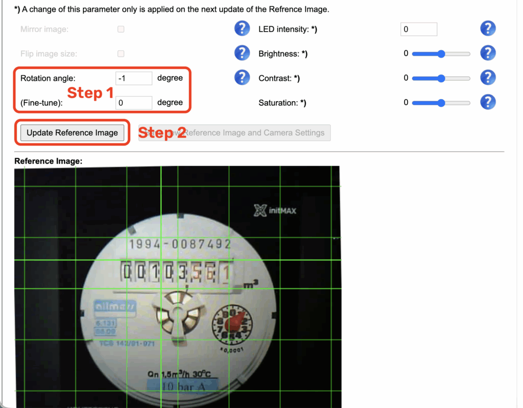 Je zde také tlačítko, pomocí kterého si můžete otočit obraz, a zároveň velmi užitečný zelený ukazatel (pointer), který lze umístit do horní části okének. Díky němu si můžete obraz precizně vyrovnat. Jakmile máte pointer správně umístěný, upravte natočení obrazu pomocí Rotation angle + (Fine-tune). Když je vše vyrovnáno a v pořádku, klikněte na Update Reference Image.