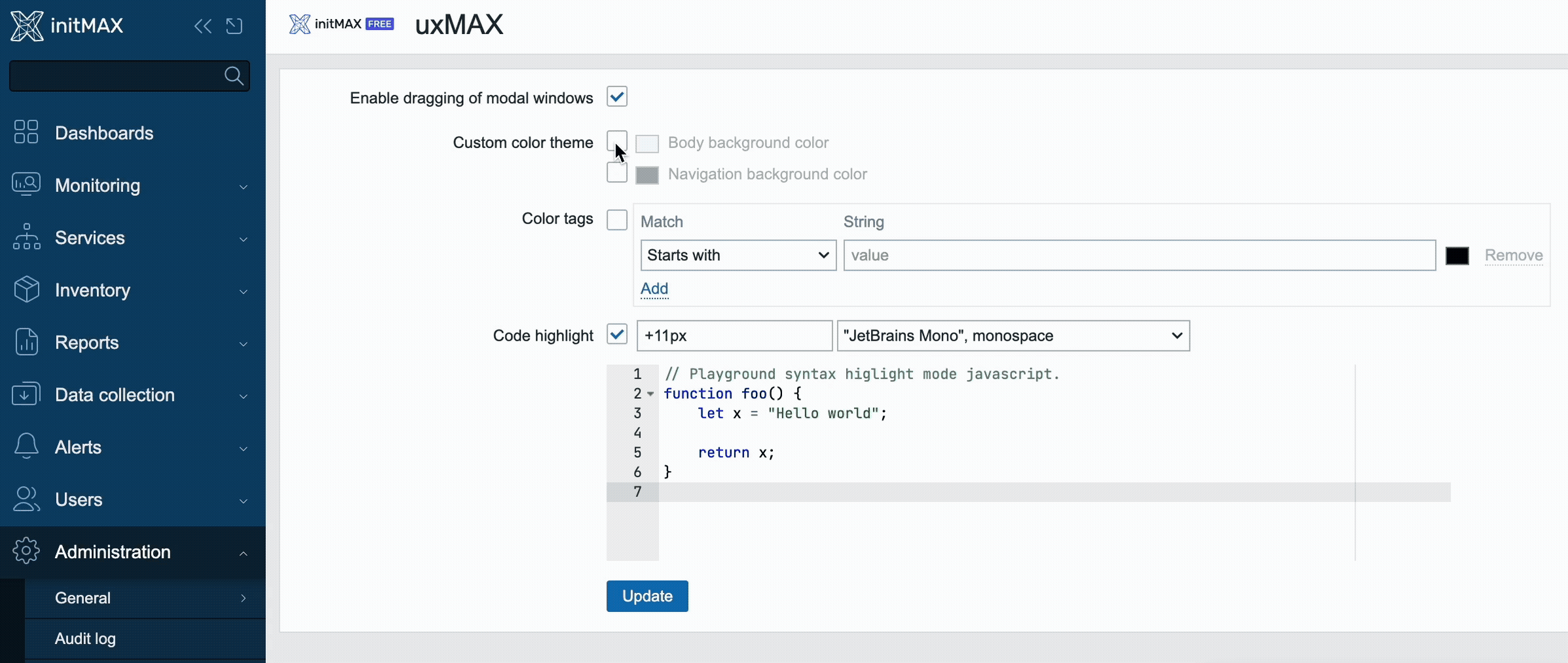 As for tags, you can create a simple, noticeable logic (red being errors from logs or critical alerts, blue being disk space, etc.). With this setup, new users will have a much easier time orienting themselves inside the Zabbix frontend. Lastly, you can choose from six options on how your JavaScript code will be formatted and highlighted, such as JetBrains Mono and Source Code Pro.