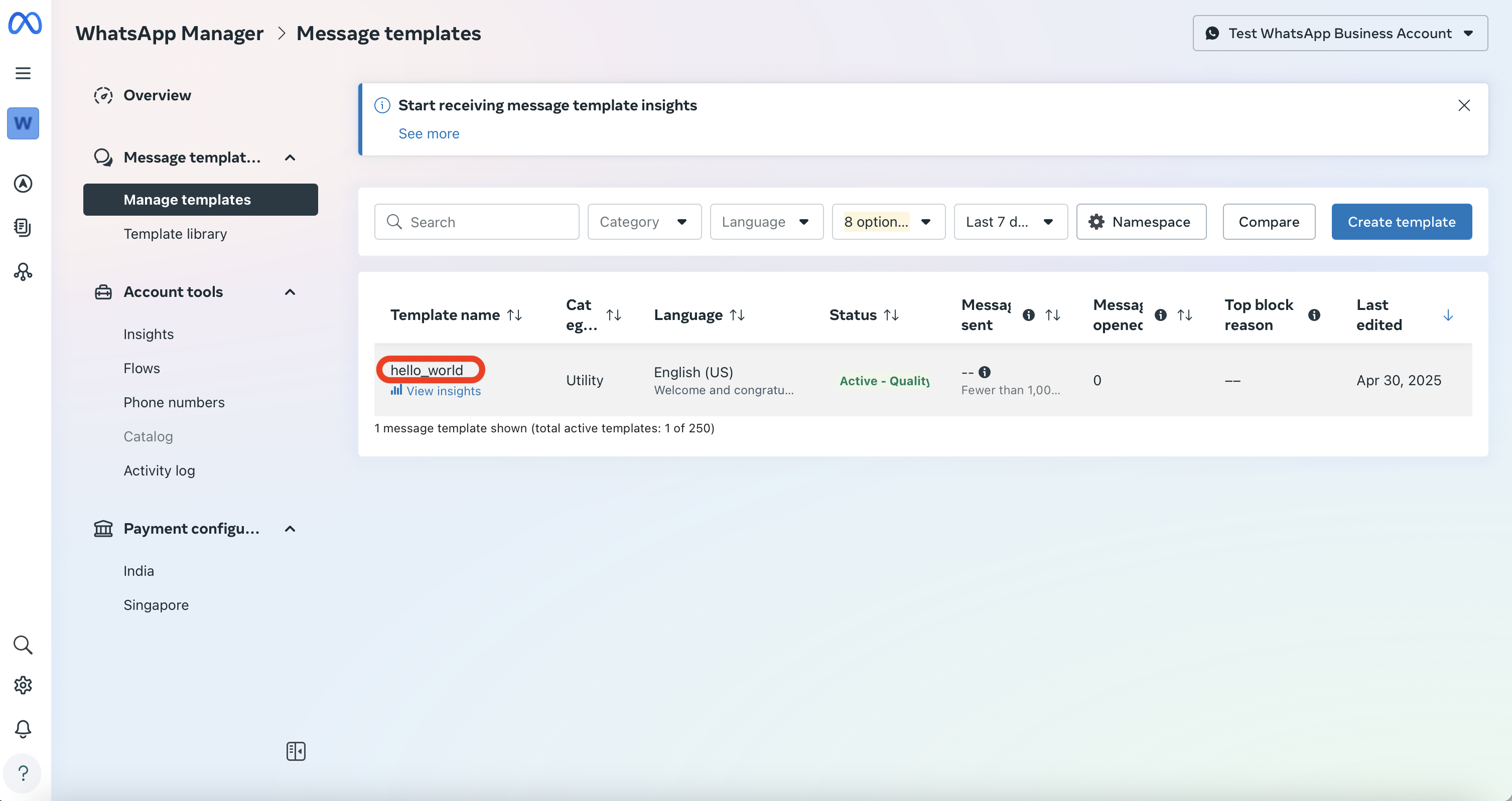 Pro neověřená (testovací) telefonní čísla máme k dispozici pouze jednu předdefinovanou šablonu, konkrétně „hello_world“. Pokud bychom použili vlastní ověřené telefonní číslo, můžeme si vytvořit šablony vlastní – například různé varianty dle závažnosti s barevnou hlavičkou či speciální šablonu pro zprávy informující o vyřešení problému.